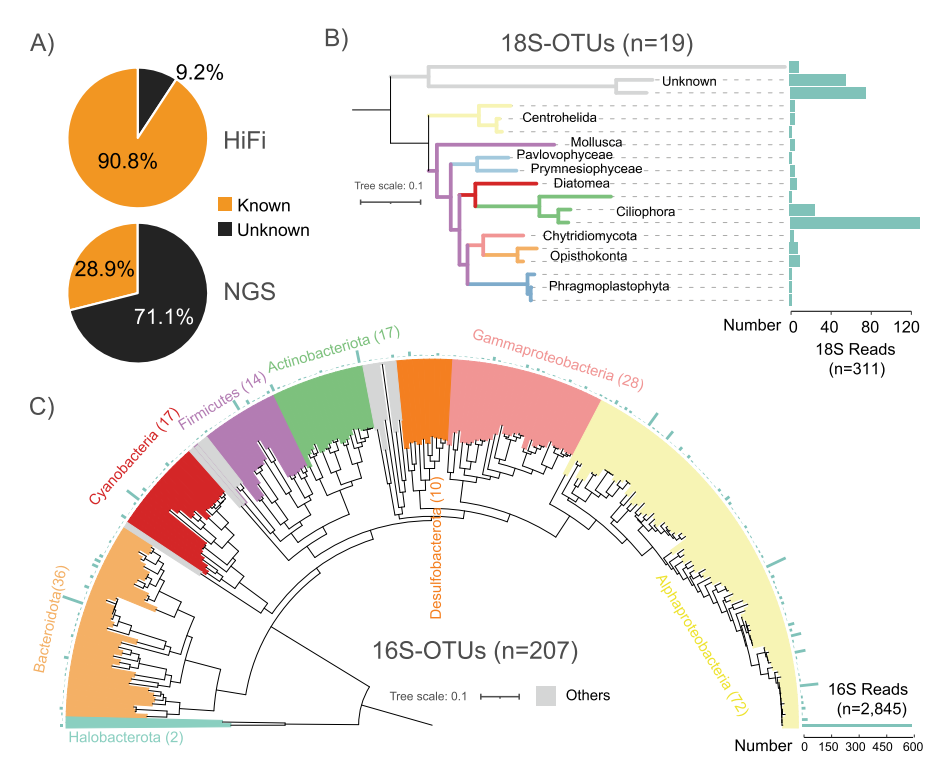 基于HiFi reads的分類分辨率。(A) HiFi和NGS讀數(shù)具有(已知)/不具有(未知)分類信息的百分比。(B和C)基于19個(gè)全長(zhǎng)18S-OTUs (B)和207個(gè)全長(zhǎng)16S-OTUs (C)的系統(tǒng)進(jìn)化樹(shù)